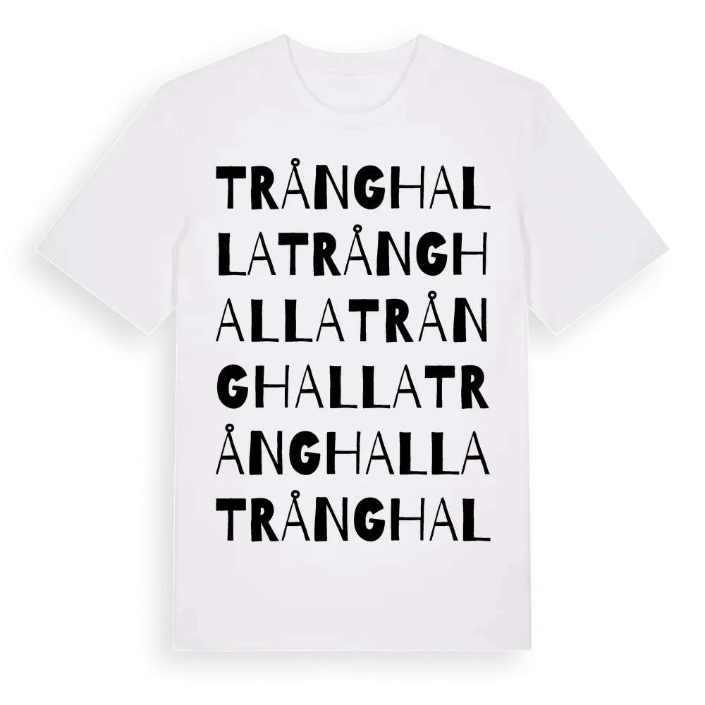 Trånghalla ordlek t-shirt är inspirerad av stadsdelen Trånghalla i Jönköpings län, Sverige. Tröjan är designad för dig som har en speciell koppling till platsen – oavsett om du bor här, har rötterna här eller bara älskar Trånghalla.