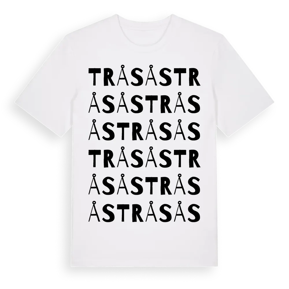 Tråsås ordlek t-shirt är inspirerad av byn Tråsås i Jönköpings län, Sverige. Tröjan är designad för dig som har en speciell koppling till platsen – oavsett om du bor här, har rötterna här eller bara älskar Tråsås.