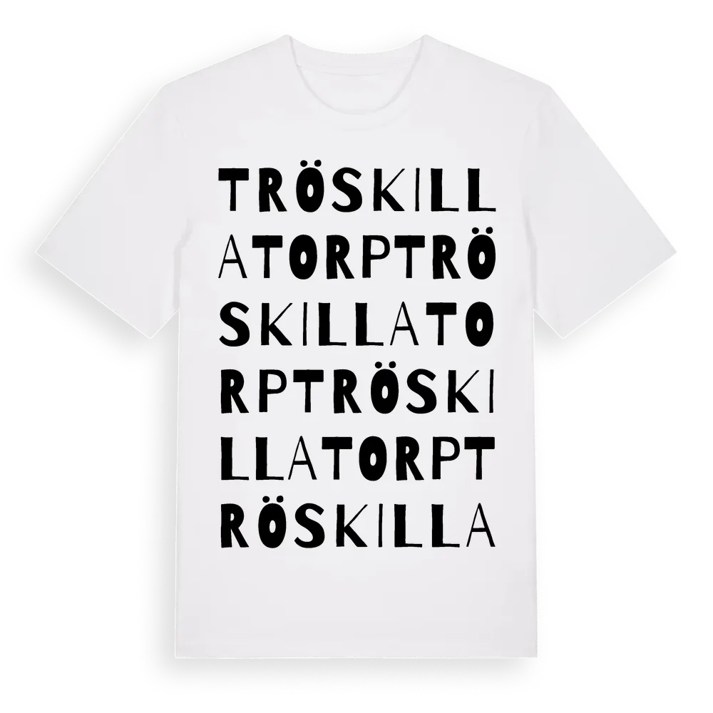 Tröskillatorp ordlek t-shirt är inspirerad av Tröskillatorp i Jönköpings län, Sverige. Tröjan är designad för dig som har en speciell koppling till platsen – oavsett om du bor här, har rötterna här eller bara älskar Tröskillatorp.
