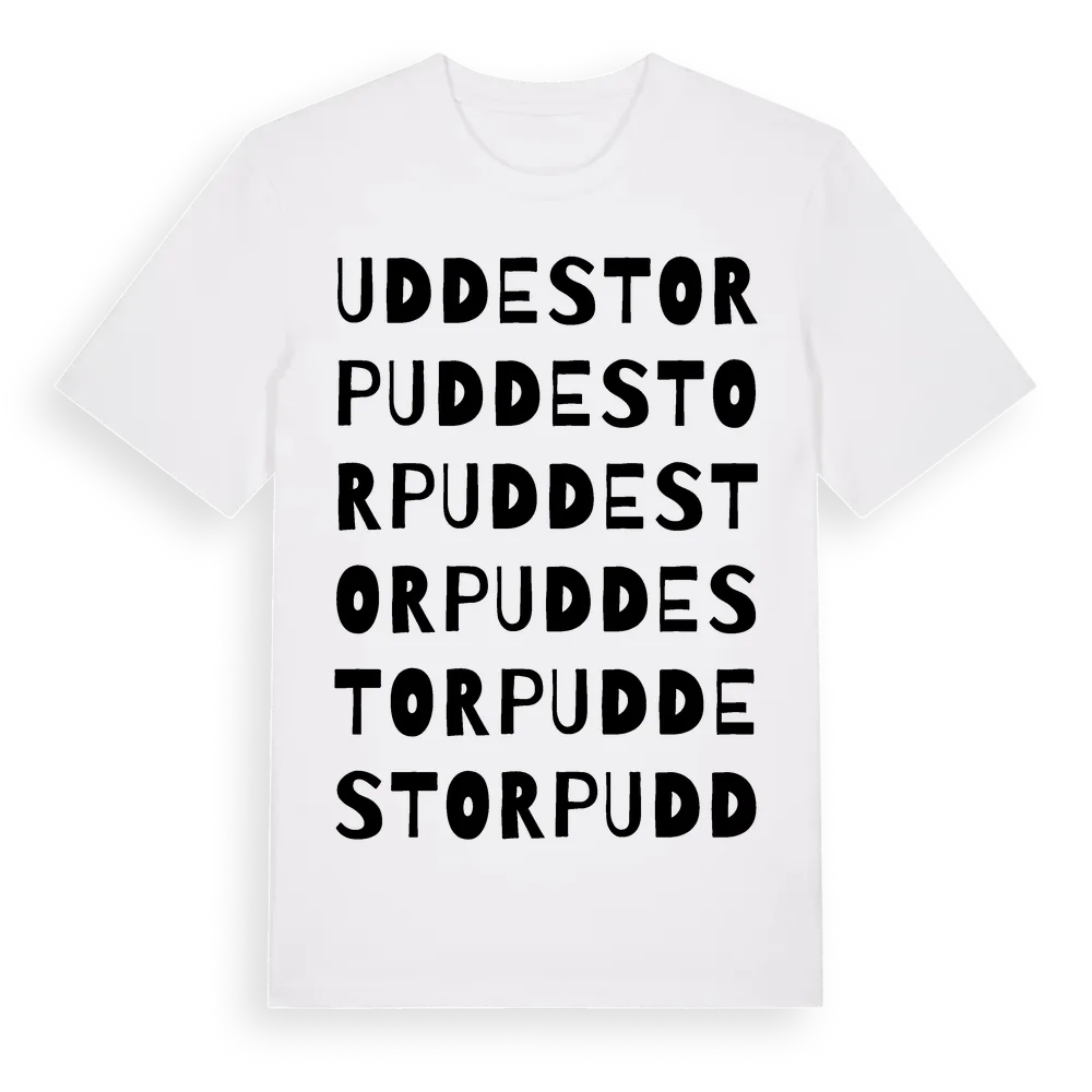 Uddestorp ordlek t-shirt är inspirerad av byn Uddestorp i Jönköpings län, Sverige. Tröjan är designad för dig som har en speciell koppling till platsen – oavsett om du bor här, har rötterna här eller bara älskar Uddestorp.