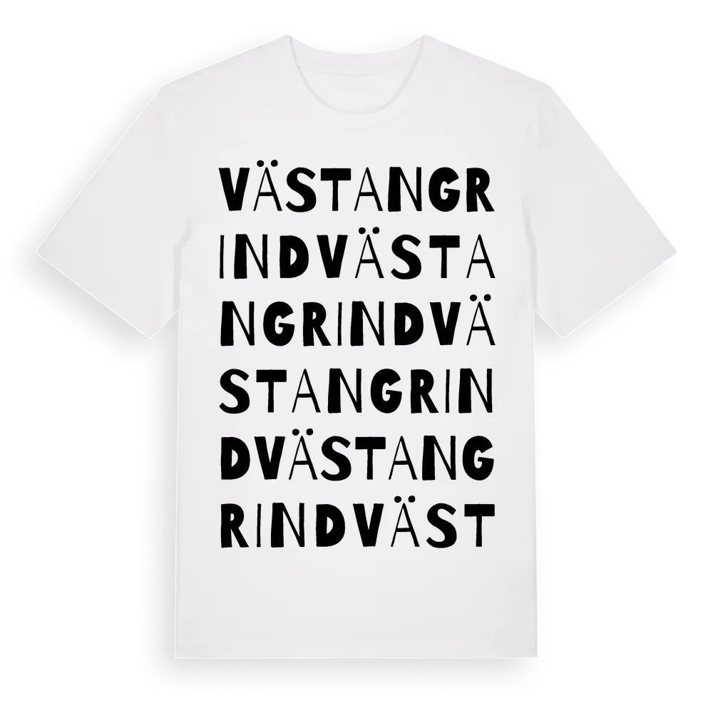 Västangrind ordlek t-shirt är inspirerad av Västangrind i Jönköpings län, Sverige. Tröjan är designad för dig som har en speciell koppling till platsen – oavsett om du bor här, har rötterna här eller bara älskar Västangrind.