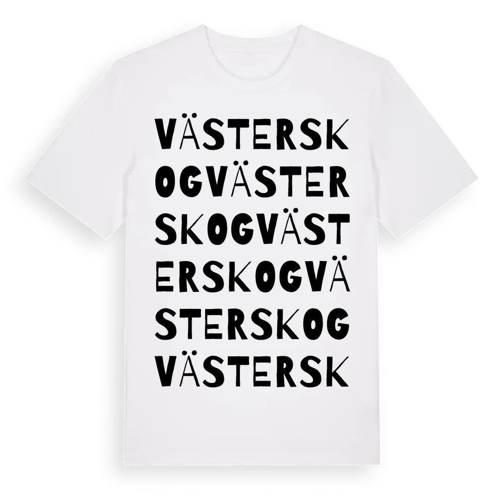 Västerskog ordlek t-shirt är inspirerad av Västerskog i Jönköpings län, Sverige. Tröjan är designad för dig som har en speciell koppling till platsen – oavsett om du bor här, har rötterna här eller bara älskar Västerskog.