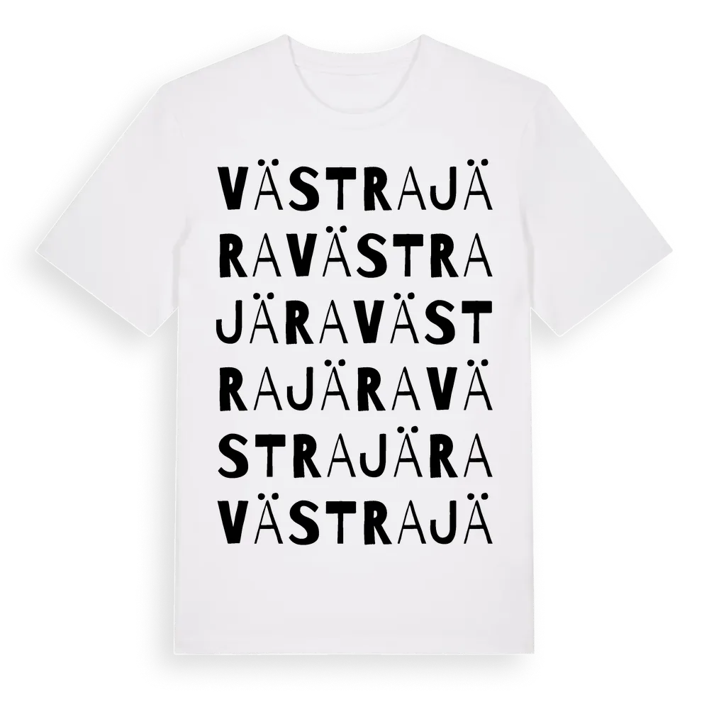 Västra Jära ordlek t-shirt är inspirerad av Västra Jära i Jönköpings län, Sverige. Tröjan är designad för dig som har en speciell koppling till platsen – oavsett om du bor här, har rötterna här eller bara älskar Västra Jära.