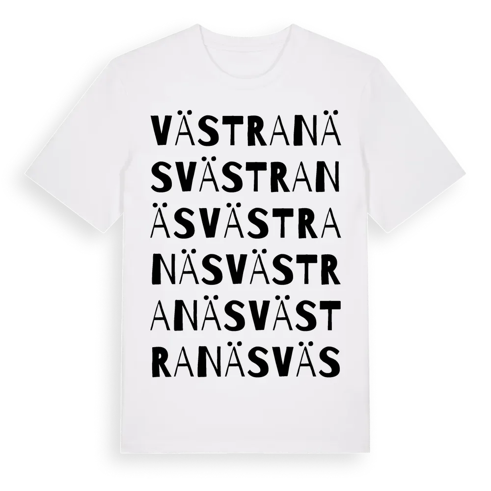 Västra Näs ordlek t-shirt är inspirerad av Västra Näs i Jönköpings län, Sverige. Tröjan är designad för dig som har en speciell koppling till platsen – oavsett om du bor här, har rötterna här eller bara älskar Västra Näs.