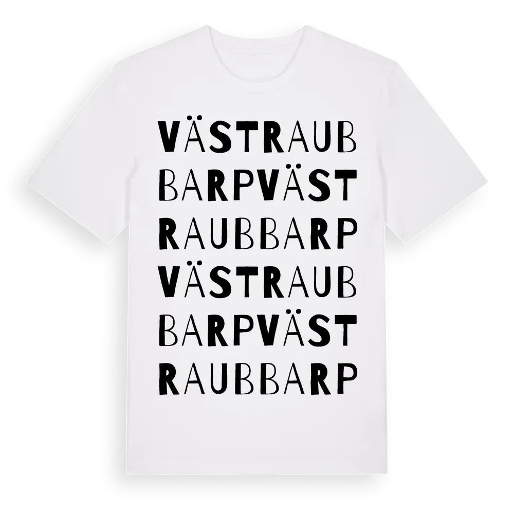 Västra Ubbarp ordlek t-shirt är inspirerad av byn Västra Ubbarp i Jönköpings län, Sverige. Tröjan är designad för dig som har en speciell koppling till platsen – oavsett om du bor här, har rötterna här eller bara älskar Västra Ubbarp.