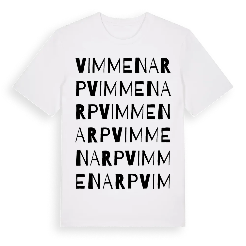 Vimmenarp ordlek t-shirt är inspirerad av Vimmenarp i Jönköpings län, Sverige. Tröjan är designad för dig som har en speciell koppling till platsen – oavsett om du bor här, har rötterna här eller bara älskar Vimmenarp.