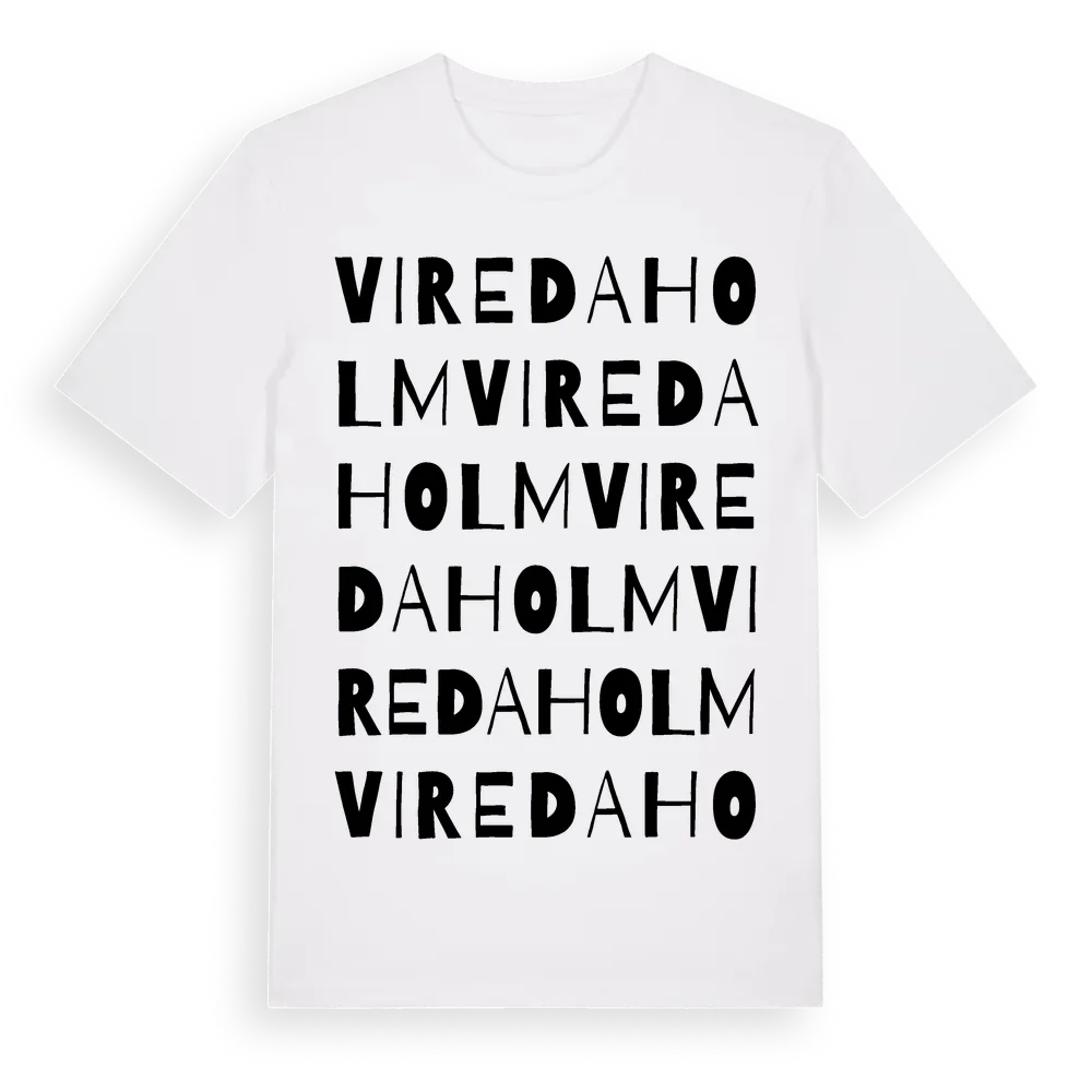 Viredaholm ordlek t-shirt är inspirerad av Viredaholm i Jönköpings län, Sverige. Tröjan är designad för dig som har en speciell koppling till platsen – oavsett om du bor här, har rötterna här eller bara älskar Viredaholm.
