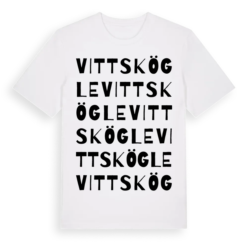 Vittskögle ordlek t-shirt är inspirerad av byn Vittskögle i Jönköpings län, Sverige. Tröjan är designad för dig som har en speciell koppling till platsen – oavsett om du bor här, har rötterna här eller bara älskar Vittskögle.