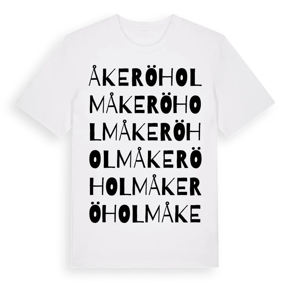 Åkeröholm ordlek t-shirt är inspirerad av Åkeröholm i Kalmar län, Sverige. Tröjan är designad för dig som har en speciell koppling till platsen – oavsett om du bor här, har rötterna här eller bara älskar Åkeröholm.