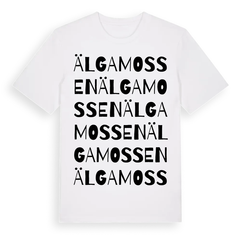 Älgamossen ordlek t-shirt är inspirerad av Älgamossen i Kalmar län, Sverige. Tröjan är designad för dig som har en speciell koppling till platsen – oavsett om du bor här, har rötterna här eller bara älskar Älgamossen.