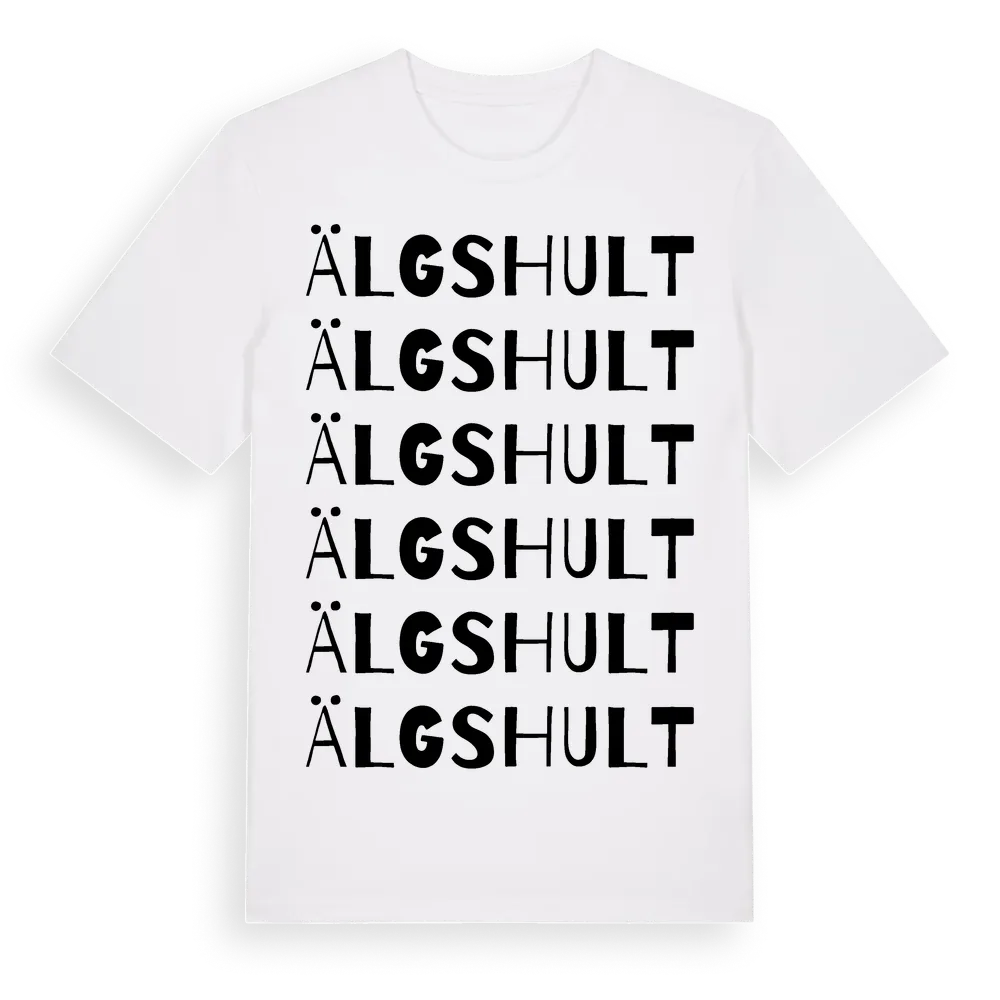 En ordlek byggd på Älgshults namn. Subtilt och klurig – ett motiv som bara de som verkligen känner platsen fullt ut förstår. Premium bomull, unisex – från Älgshult i Kalmar län.