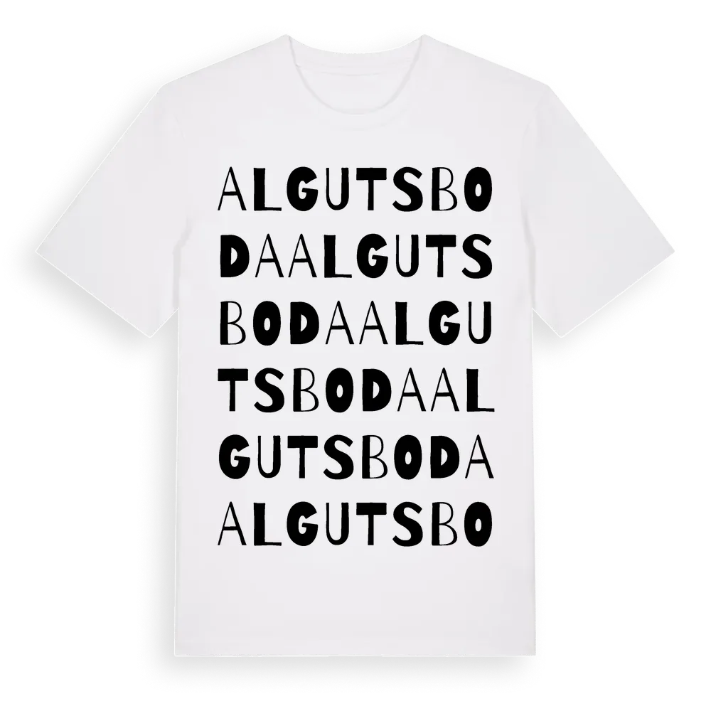 Algutsboda ordlek t-shirt är inspirerad av byn Algutsboda i Kalmar län, Sverige. Tröjan är designad för dig som har en speciell koppling till platsen – oavsett om du bor här, har rötterna här eller bara älskar Algutsboda.
