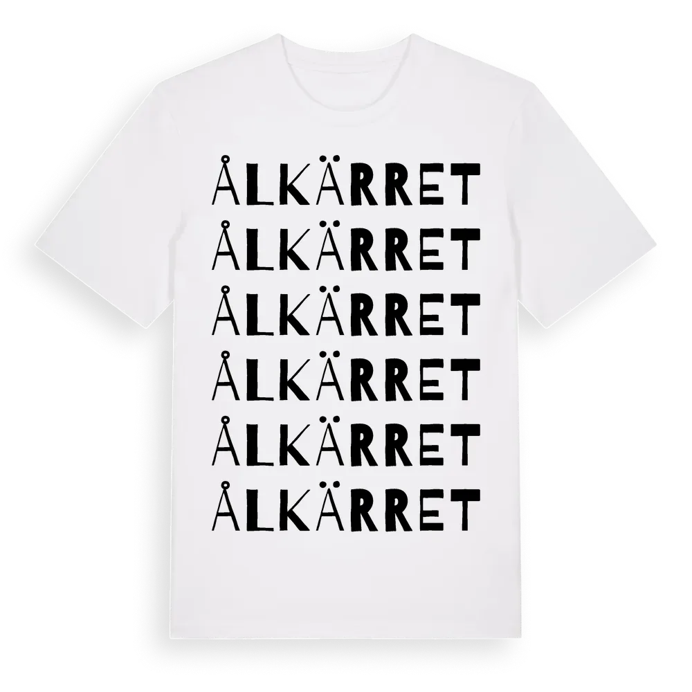 Ålkärret ordlek t-shirt är inspirerad av Ålkärret i Kalmar län, Sverige. Tröjan är designad för dig som har en speciell koppling till platsen – oavsett om du bor här, har rötterna här eller bara älskar Ålkärret.