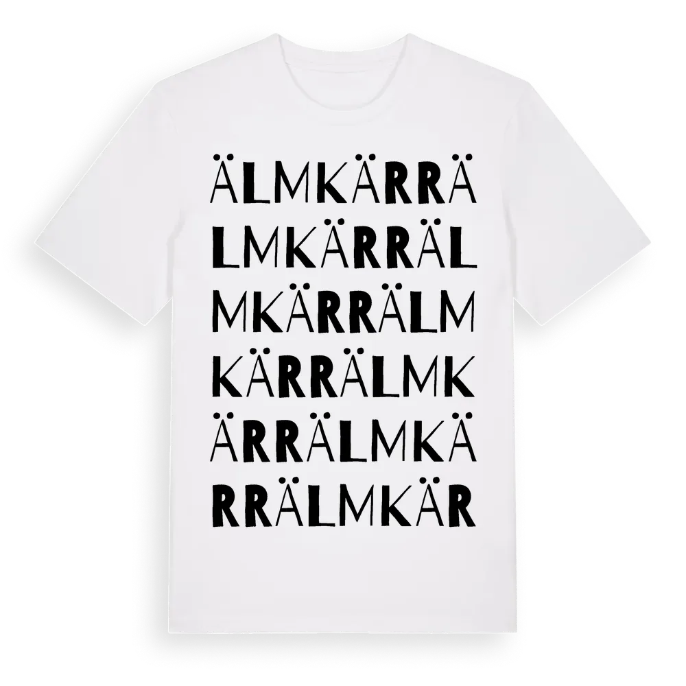 Älmkärr ordlek t-shirt är inspirerad av Älmkärr i Kalmar län, Sverige. Tröjan är designad för dig som har en speciell koppling till platsen – oavsett om du bor här, har rötterna här eller bara älskar Älmkärr.