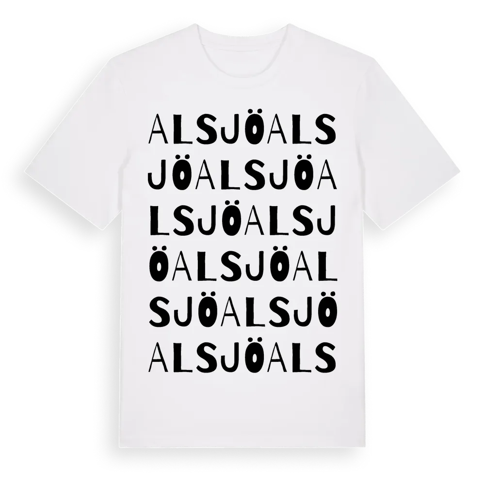 Alsjö ordlek t-shirt är inspirerad av byn Alsjö i Kalmar län, Sverige. Tröjan är designad för dig som har en speciell koppling till platsen – oavsett om du bor här, har rötterna här eller bara älskar Alsjö.