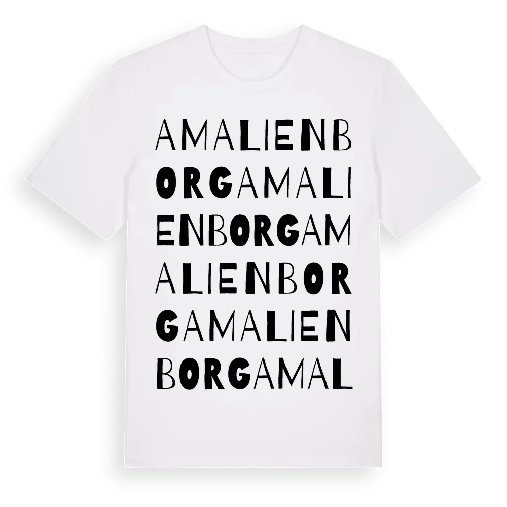 Amalienborg ordlek t-shirt är inspirerad av Amalienborg i Kalmar län, Sverige. Tröjan är designad för dig som har en speciell koppling till platsen – oavsett om du bor här, har rötterna här eller bara älskar Amalienborg.