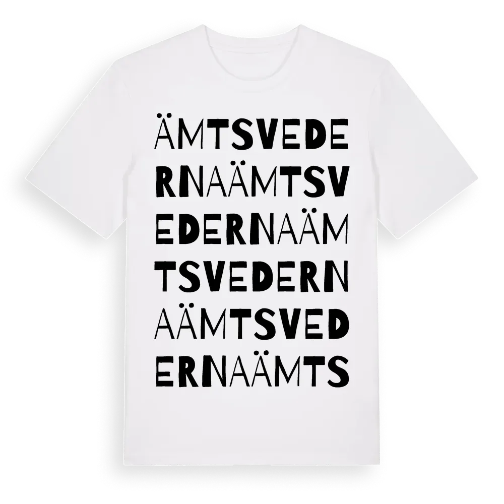 Ämtsvederna ordlek t-shirt är inspirerad av Ämtsvederna i Kalmar län, Sverige. Tröjan är designad för dig som har en speciell koppling till platsen – oavsett om du bor här, har rötterna här eller bara älskar Ämtsvederna.