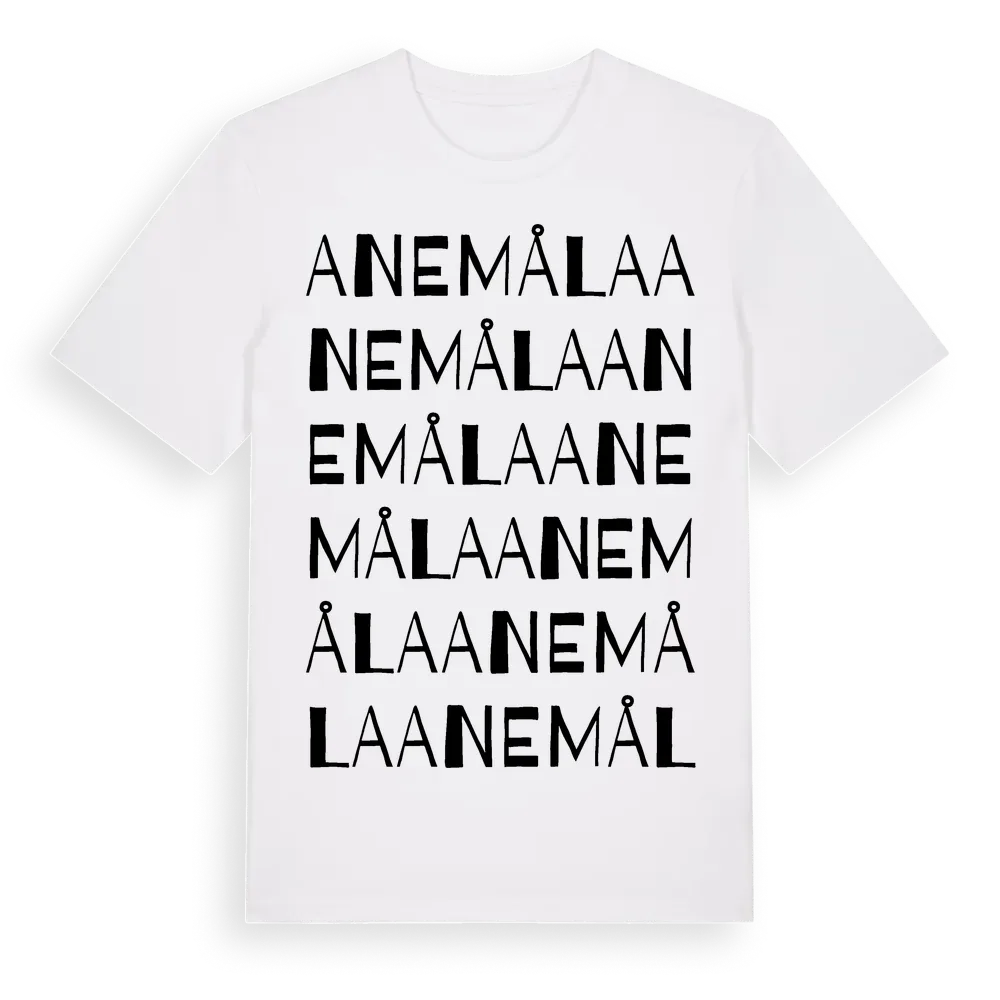Anemåla ordlek t-shirt är inspirerad av byn Anemåla i Kalmar län, Sverige. Tröjan är designad för dig som har en speciell koppling till platsen – oavsett om du bor här, har rötterna här eller bara älskar Anemåla.