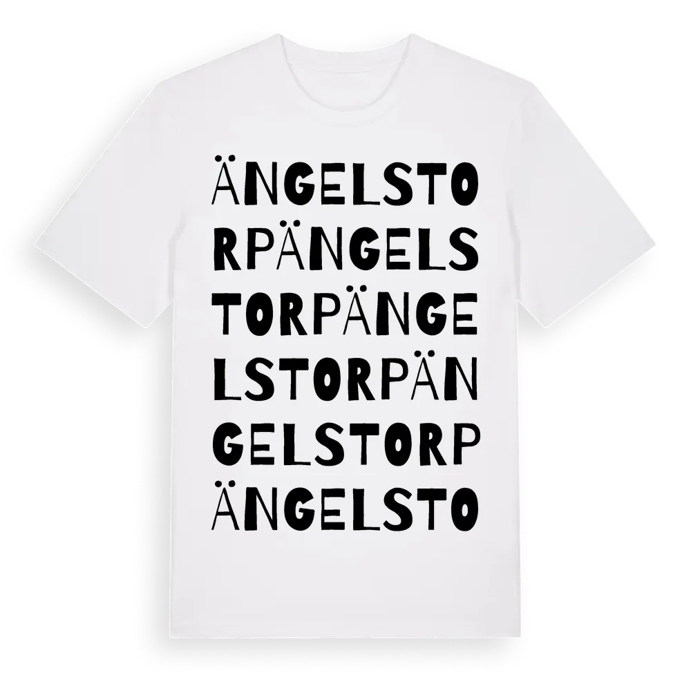 Ängelstorp ordlek t-shirt är inspirerad av byn Ängelstorp i Kalmar län, Sverige. Tröjan är designad för dig som har en speciell koppling till platsen – oavsett om du bor här, har rötterna här eller bara älskar Ängelstorp.