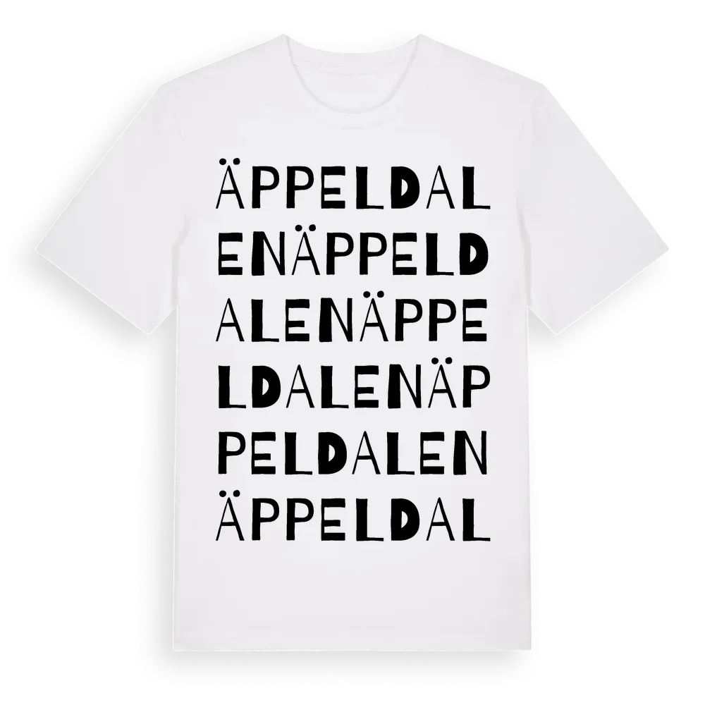 Äppeldalen ordlek t-shirt är inspirerad av Äppeldalen i Kalmar län, Sverige. Tröjan är designad för dig som har en speciell koppling till platsen – oavsett om du bor här, har rötterna här eller bara älskar Äppeldalen.