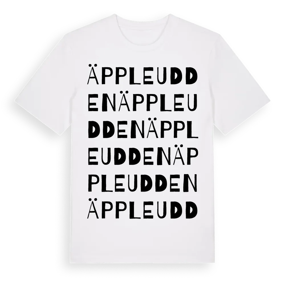 Äppleudden ordlek t-shirt är inspirerad av byn Äppleudden i Kalmar län, Sverige. Tröjan är designad för dig som har en speciell koppling till platsen – oavsett om du bor här, har rötterna här eller bara älskar Äppleudden.