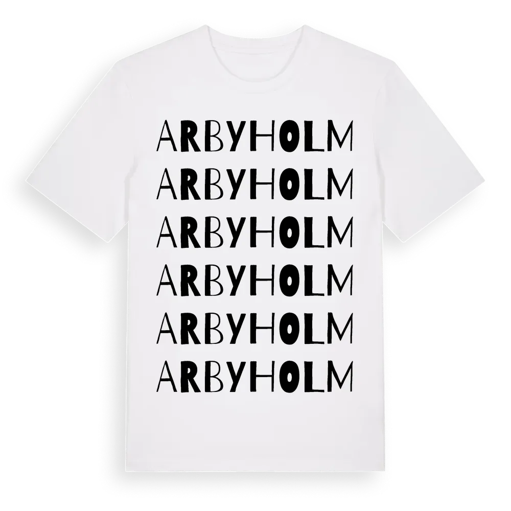 Arbyholm ordlek t-shirt är inspirerad av Arbyholm i Kalmar län, Sverige. Tröjan är designad för dig som har en speciell koppling till platsen – oavsett om du bor här, har rötterna här eller bara älskar Arbyholm.