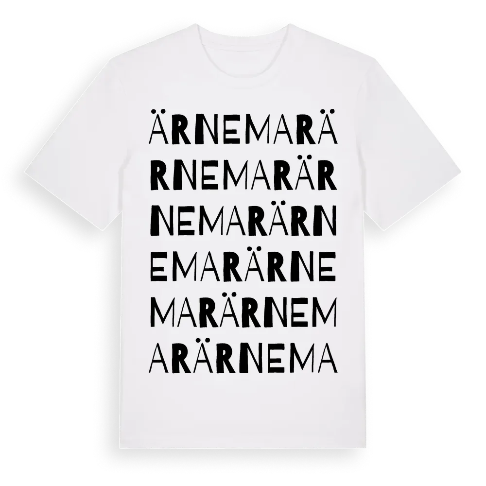 Ärnemar ordlek t-shirt är inspirerad av stadsdelen Ärnemar i Kalmar län, Sverige. Tröjan är designad för dig som har en speciell koppling till platsen – oavsett om du bor här, har rötterna här eller bara älskar Ärnemar.