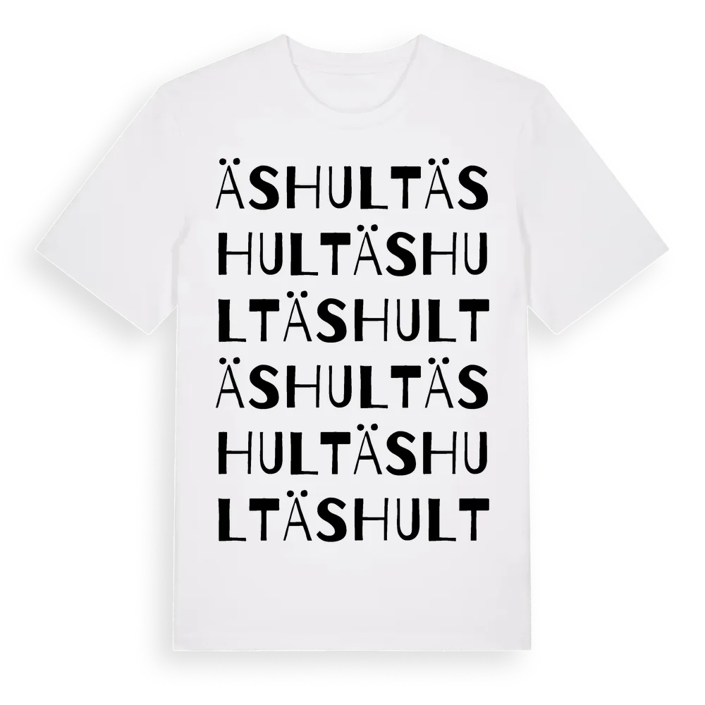 Äshult ordlek t-shirt är inspirerad av byn Äshult i Kalmar län, Sverige. Tröjan är designad för dig som har en speciell koppling till platsen – oavsett om du bor här, har rötterna här eller bara älskar Äshult.
