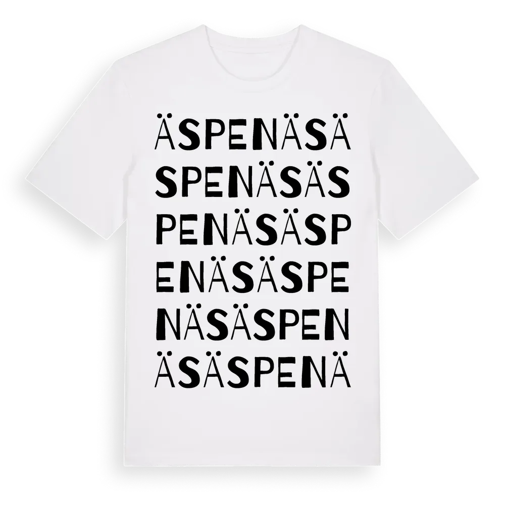Äspenäs ordlek t-shirt är inspirerad av byn Äspenäs i Kalmar län, Sverige. Tröjan är designad för dig som har en speciell koppling till platsen – oavsett om du bor här, har rötterna här eller bara älskar Äspenäs.