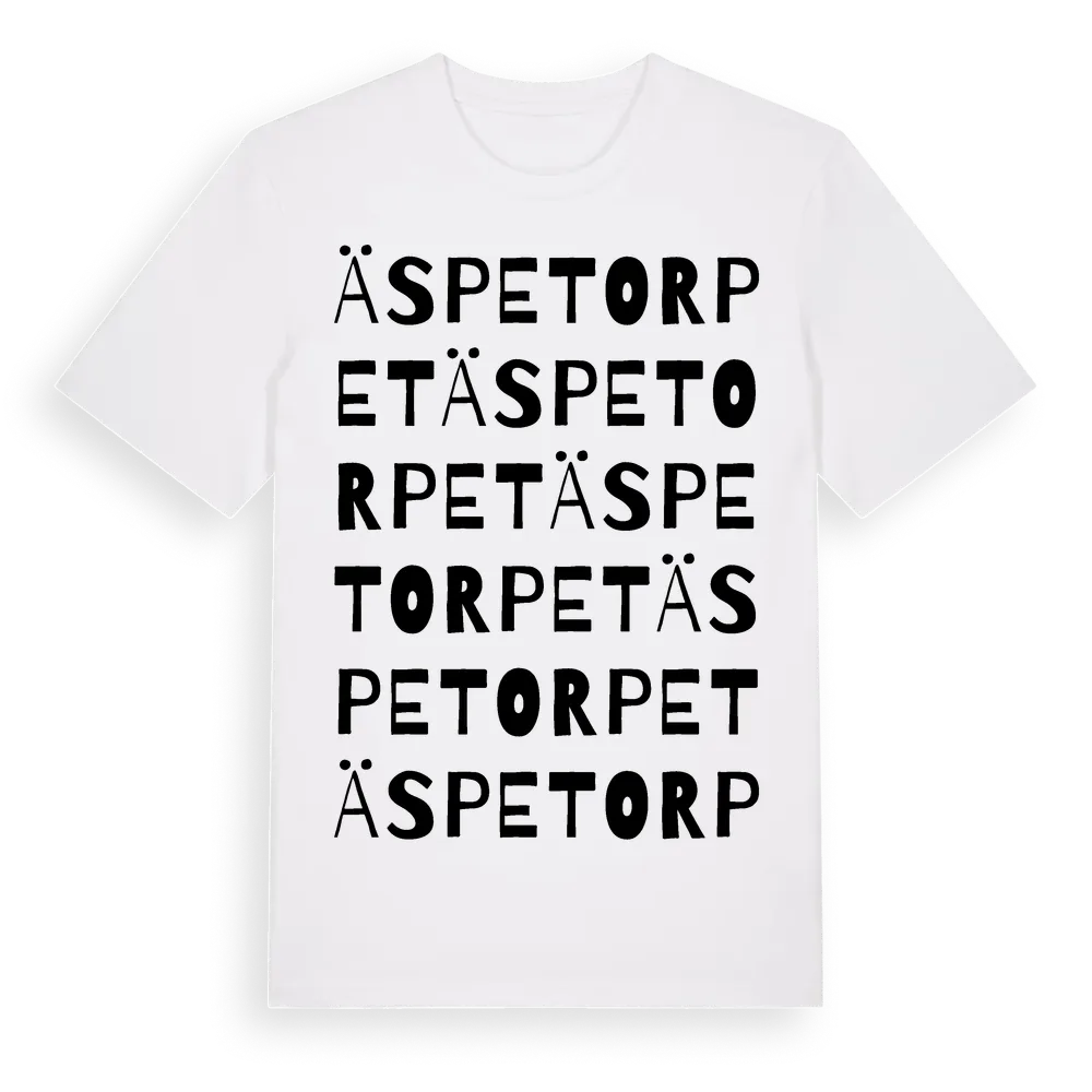 Äspetorpet ordlek t-shirt är inspirerad av Äspetorpet i Kalmar län, Sverige. Tröjan är designad för dig som har en speciell koppling till platsen – oavsett om du bor här, har rötterna här eller bara älskar Äspetorpet.