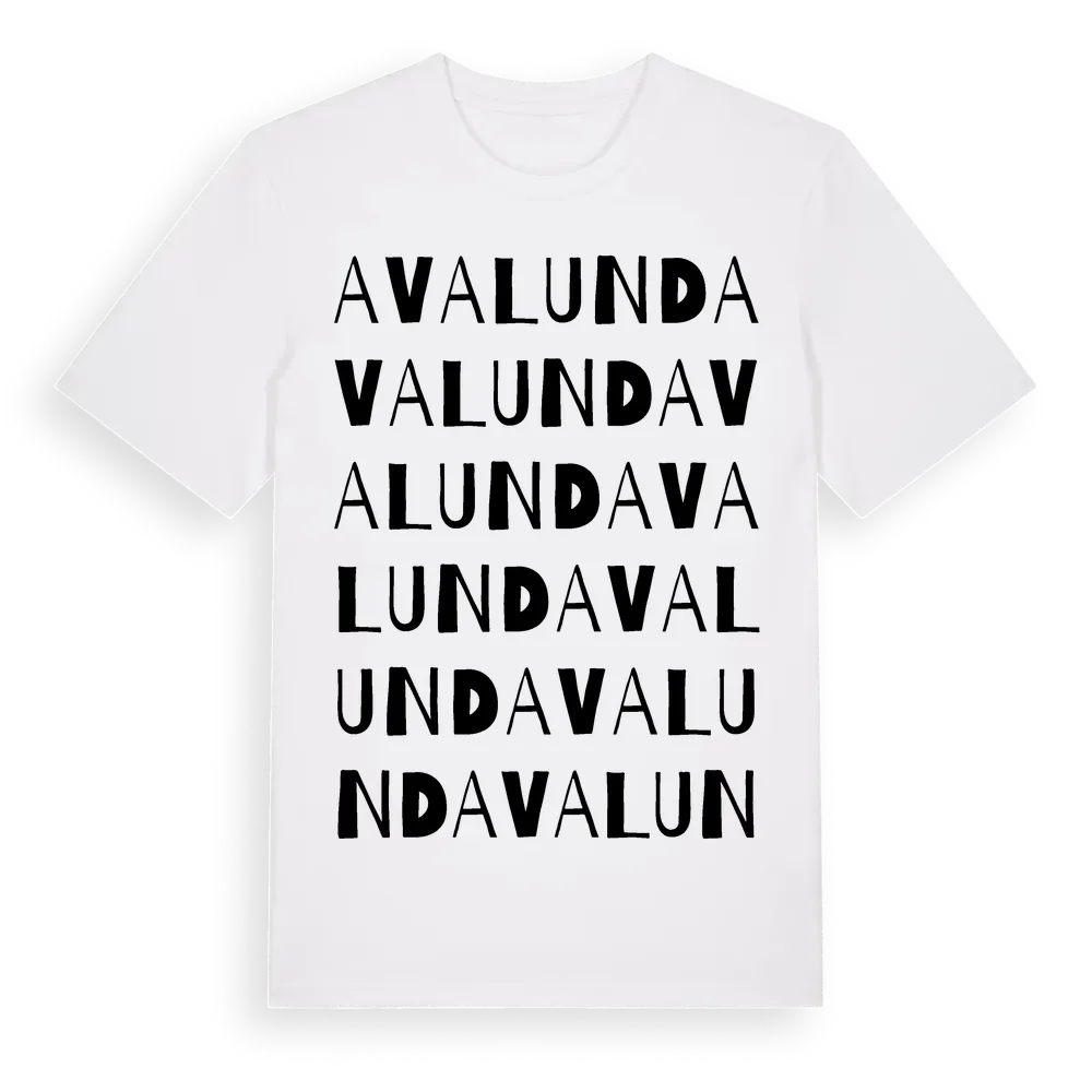 Avalund ordlek t-shirt är inspirerad av Avalund i Kalmar län, Sverige. Tröjan är designad för dig som har en speciell koppling till platsen – oavsett om du bor här, har rötterna här eller bara älskar Avalund.