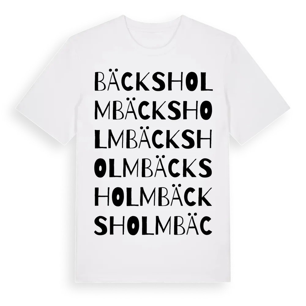 Bäcksholm ordlek t-shirt är inspirerad av Bäcksholm i Kalmar län, Sverige. Tröjan är designad för dig som har en speciell koppling till platsen – oavsett om du bor här, har rötterna här eller bara älskar Bäcksholm.