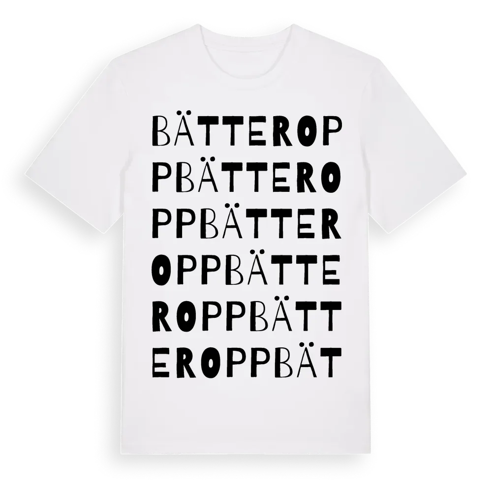 Bätteropp ordlek t-shirt är inspirerad av Bätteropp i Kalmar län, Sverige. Tröjan är designad för dig som har en speciell koppling till platsen – oavsett om du bor här, har rötterna här eller bara älskar Bätteropp.