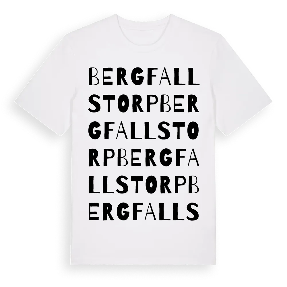 Bergfallstorp ordlek t-shirt är inspirerad av Bergfallstorp i Kalmar län, Sverige. Tröjan är designad för dig som har en speciell koppling till platsen – oavsett om du bor här, har rötterna här eller bara älskar Bergfallstorp.