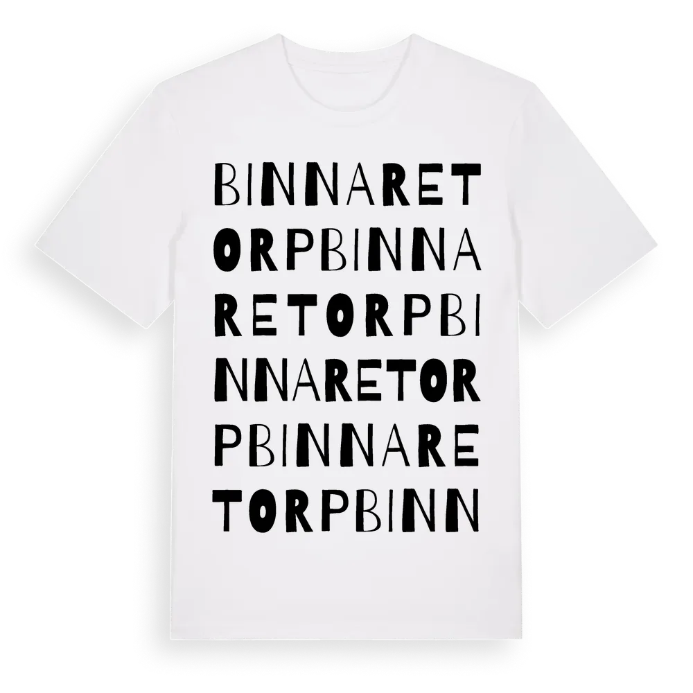 Binnaretorp ordlek t-shirt är inspirerad av byn Binnaretorp i Kalmar län, Sverige. Tröjan är designad för dig som har en speciell koppling till platsen – oavsett om du bor här, har rötterna här eller bara älskar Binnaretorp.