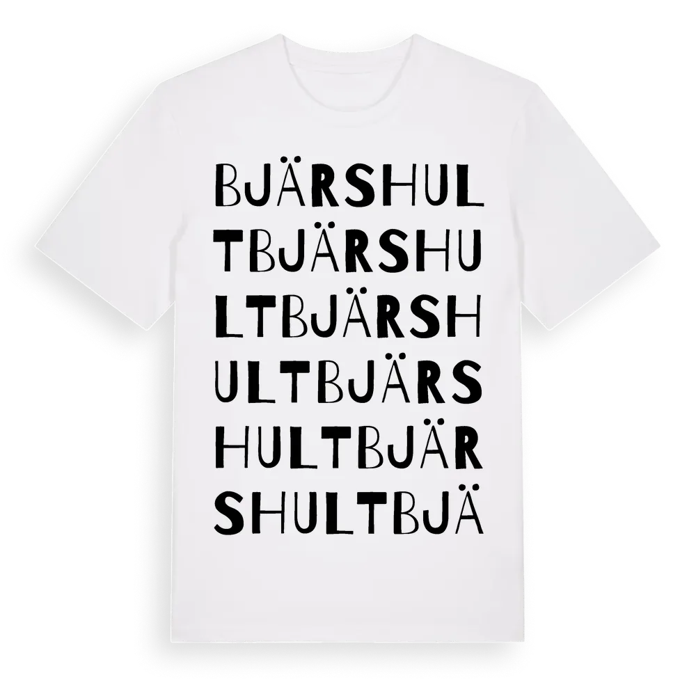 Bjärshult ordlek t-shirt är inspirerad av byn Bjärshult i Kalmar län, Sverige. Tröjan är designad för dig som har en speciell koppling till platsen – oavsett om du bor här, har rötterna här eller bara älskar Bjärshult.