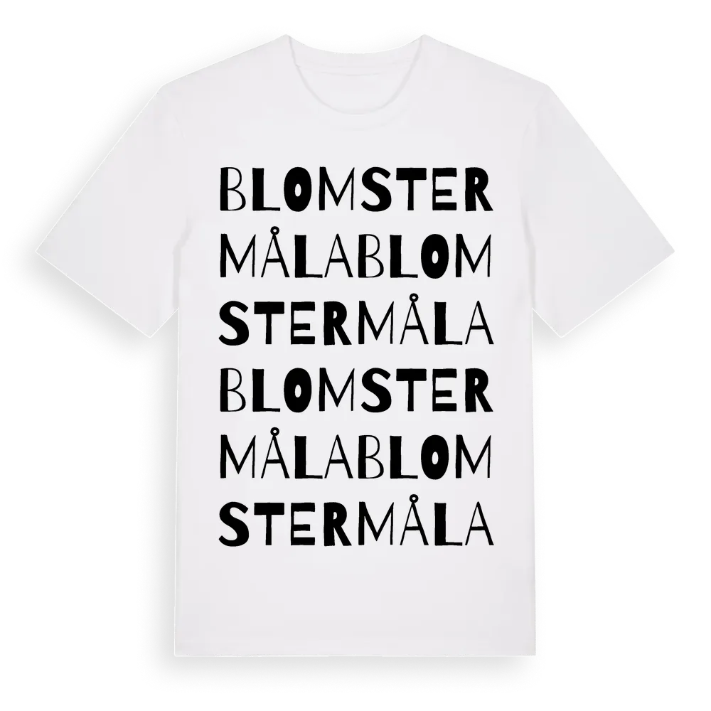 Blomstermåla ordlek t-shirt är inspirerad av Blomstermåla i Kalmar län, Sverige. Tröjan är designad för dig som har en speciell koppling till platsen – oavsett om du bor här, har rötterna här eller bara älskar Blomstermåla.