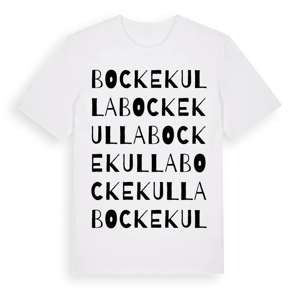 Bockekulla ordlek t-shirt är inspirerad av byn Bockekulla i Kalmar län, Sverige. Tröjan är designad för dig som har en speciell koppling till platsen – oavsett om du bor här, har rötterna här eller bara älskar Bockekulla.