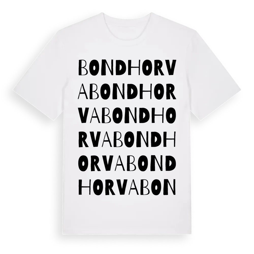 Bondhorva ordlek t-shirt är inspirerad av Bondhorva i Kalmar län, Sverige. Tröjan är designad för dig som har en speciell koppling till platsen – oavsett om du bor här, har rötterna här eller bara älskar Bondhorva.