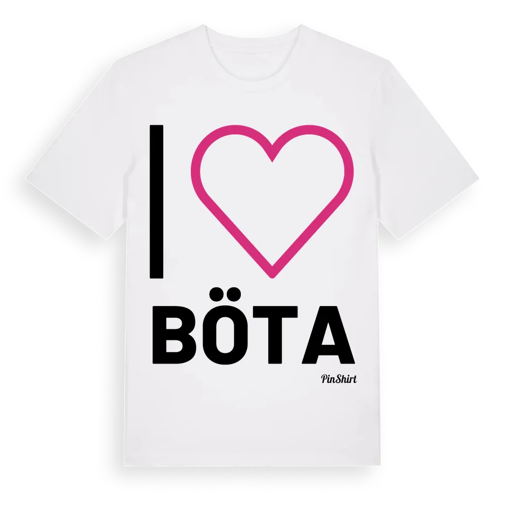 Det klassiska "I ❤ Böta"-motivet i stort format som täcker hela bröstet. För dig som vill visa kärleken till Böta på riktigt. Premium bomull, unisex – från Böta i Kalmar län.