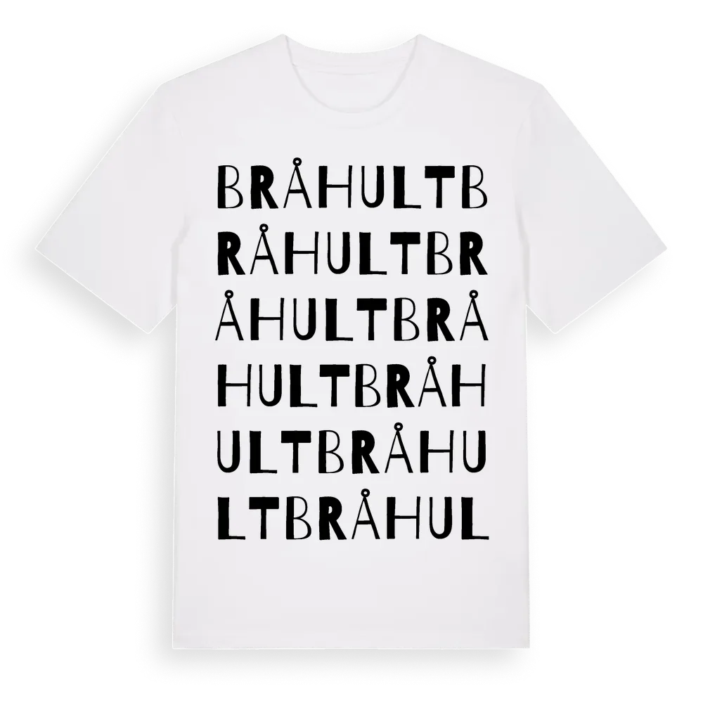 Bråhult ordlek t-shirt är inspirerad av byn Bråhult i Kalmar län, Sverige. Tröjan är designad för dig som har en speciell koppling till platsen – oavsett om du bor här, har rötterna här eller bara älskar Bråhult.