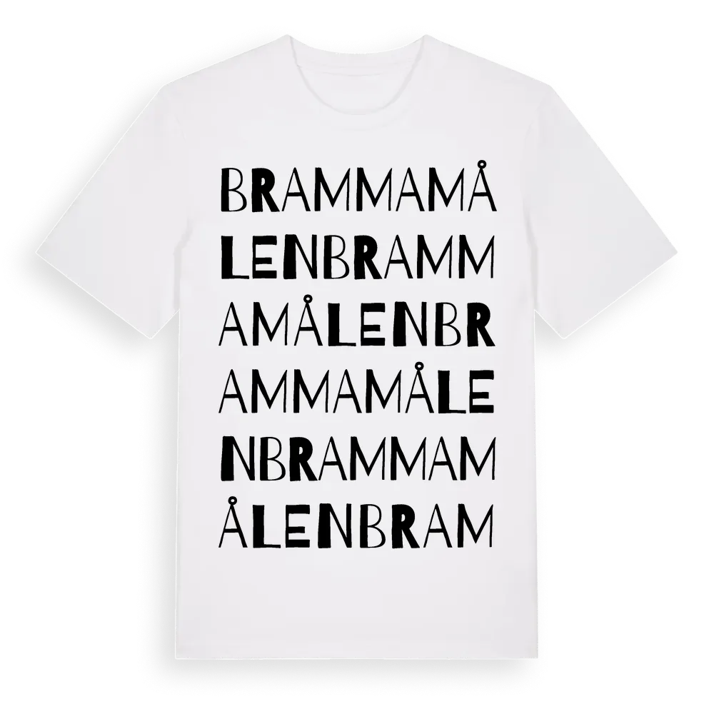 Brammamålen ordlek t-shirt är inspirerad av Brammamålen i Kalmar län, Sverige. Tröjan är designad för dig som har en speciell koppling till platsen – oavsett om du bor här, har rötterna här eller bara älskar Brammamålen.