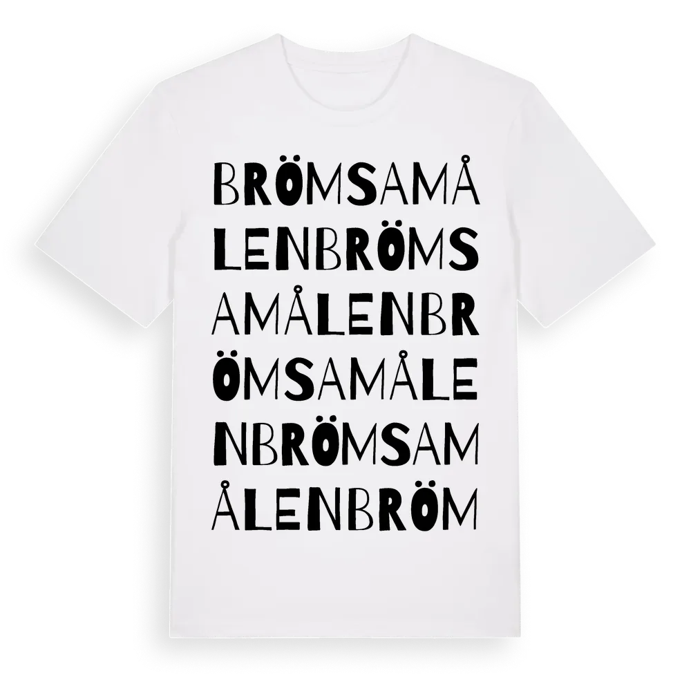 Brömsamålen ordlek t-shirt är inspirerad av Brömsamålen i Kalmar län, Sverige. Tröjan är designad för dig som har en speciell koppling till platsen – oavsett om du bor här, har rötterna här eller bara älskar Brömsamålen.