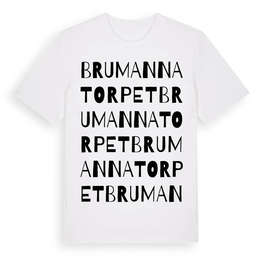 Brumannatorpet ordlek t-shirt är inspirerad av Brumannatorpet i Kalmar län, Sverige. Tröjan är designad för dig som har en speciell koppling till platsen – oavsett om du bor här, har rötterna här eller bara älskar Brumannatorpet.