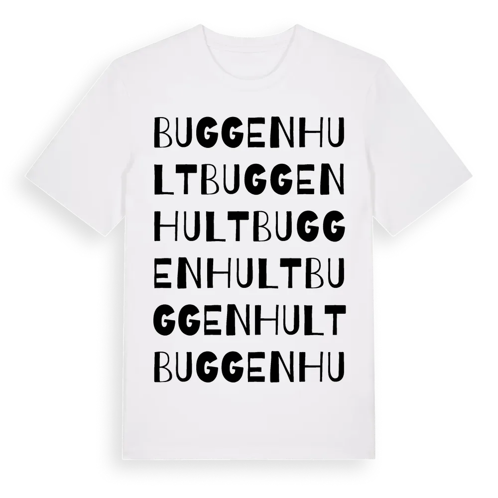Buggenhult ordlek t-shirt är inspirerad av byn Buggenhult i Kalmar län, Sverige. Tröjan är designad för dig som har en speciell koppling till platsen – oavsett om du bor här, har rötterna här eller bara älskar Buggenhult.