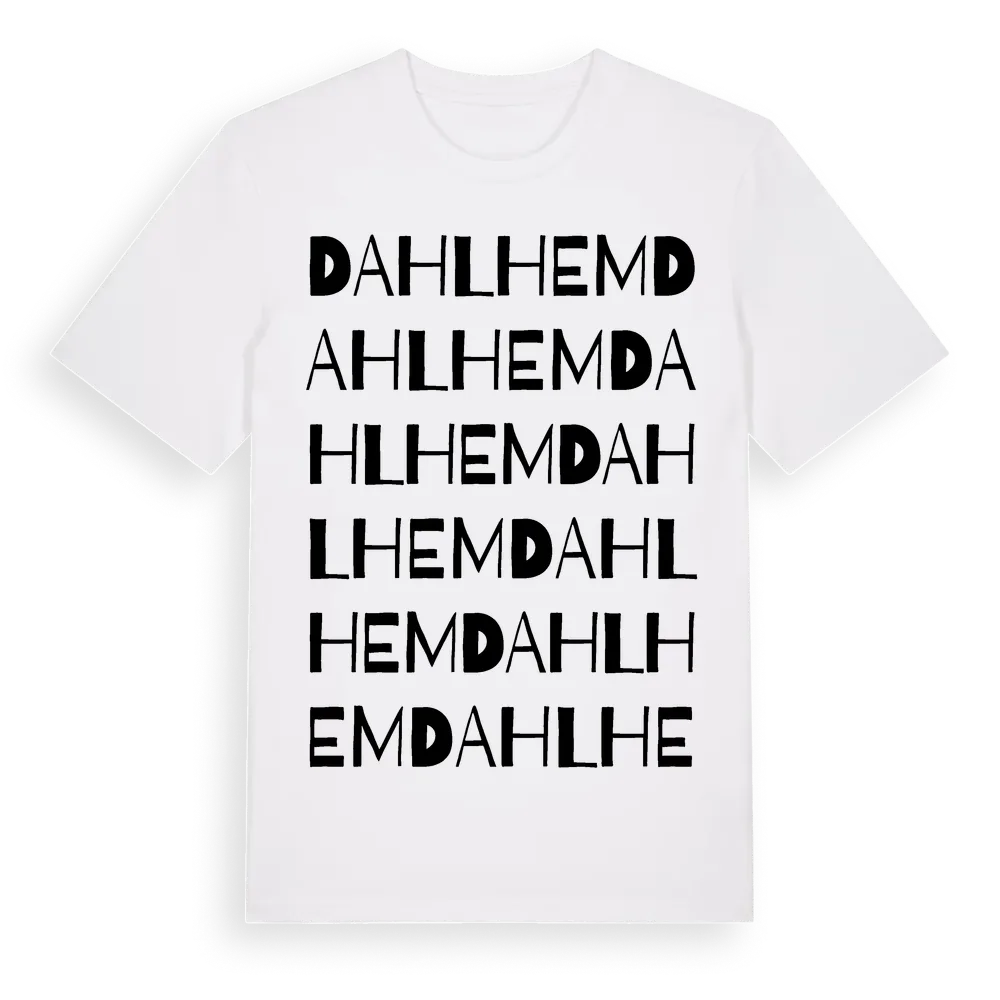 Dahlhem ordlek t-shirt är inspirerad av byn Dahlhem i Kalmar län, Sverige. Tröjan är designad för dig som har en speciell koppling till platsen – oavsett om du bor här, har rötterna här eller bara älskar Dahlhem.