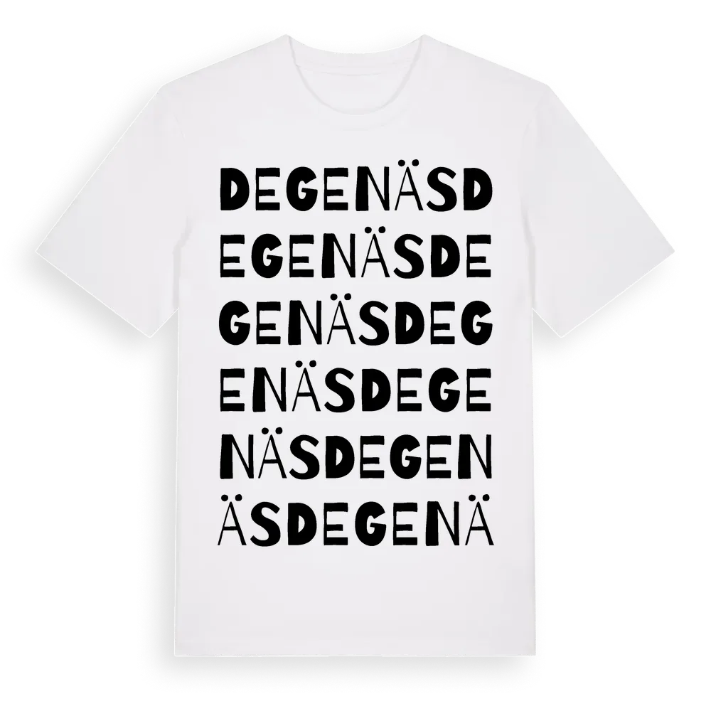 Degenäs ordlek t-shirt är inspirerad av Degenäs i Kalmar län, Sverige. Tröjan är designad för dig som har en speciell koppling till platsen – oavsett om du bor här, har rötterna här eller bara älskar Degenäs.