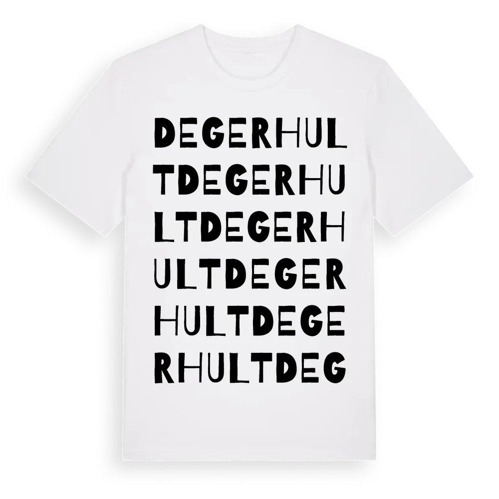 Degerhult ordlek t-shirt är inspirerad av Degerhult i Kalmar län, Sverige. Tröjan är designad för dig som har en speciell koppling till platsen – oavsett om du bor här, har rötterna här eller bara älskar Degerhult.