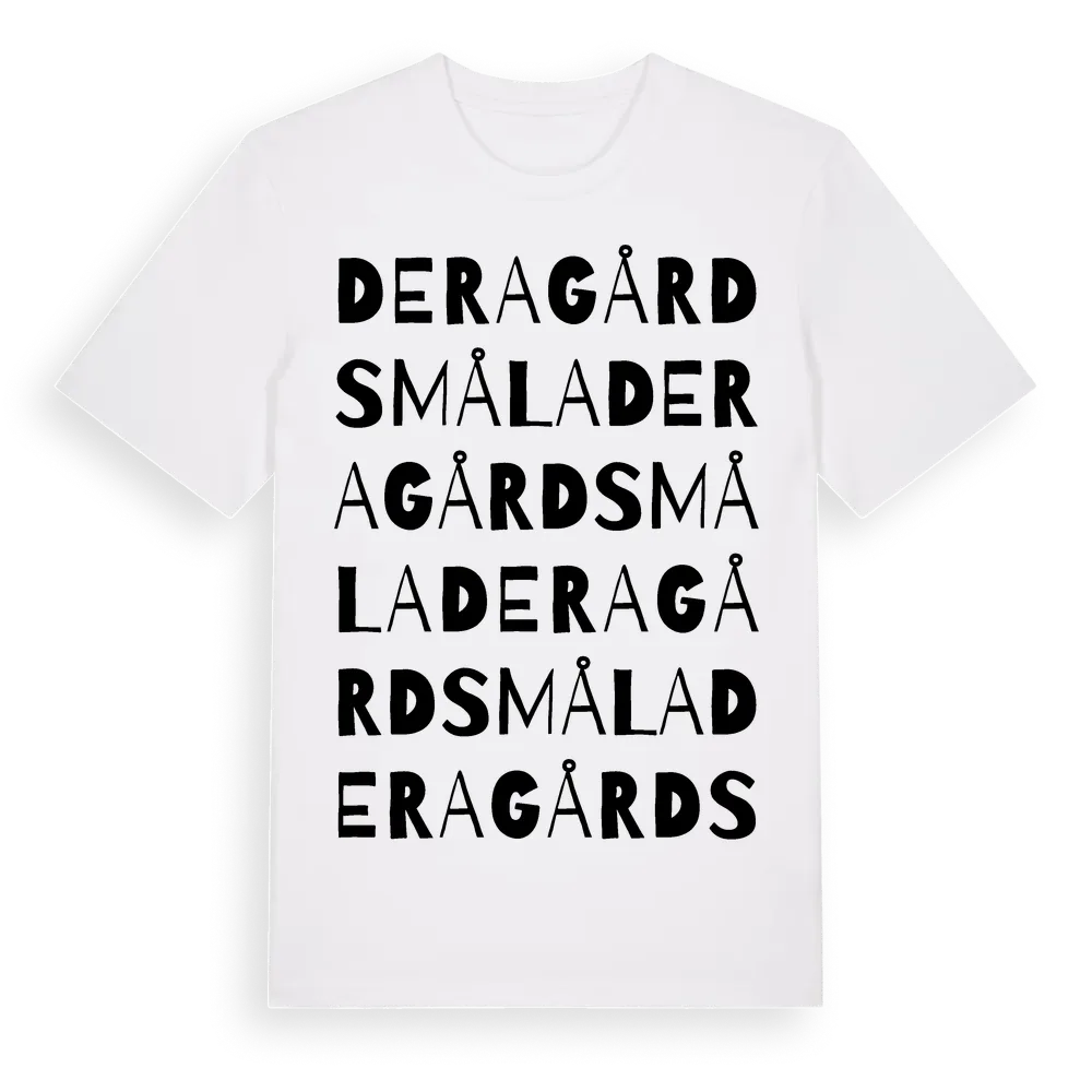 Deragårdsmåla ordlek t-shirt är inspirerad av Deragårdsmåla i Kalmar län, Sverige. Tröjan är designad för dig som har en speciell koppling till platsen – oavsett om du bor här, har rötterna här eller bara älskar Deragårdsmåla.