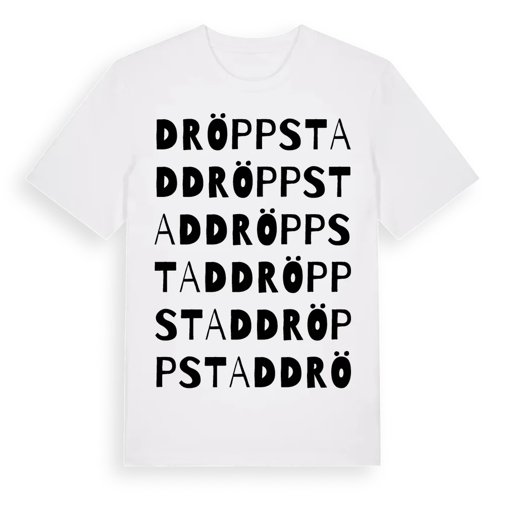 Dröppstad ordlek t-shirt är inspirerad av byn Dröppstad i Kalmar län, Sverige. Tröjan är designad för dig som har en speciell koppling till platsen – oavsett om du bor här, har rötterna här eller bara älskar Dröppstad.